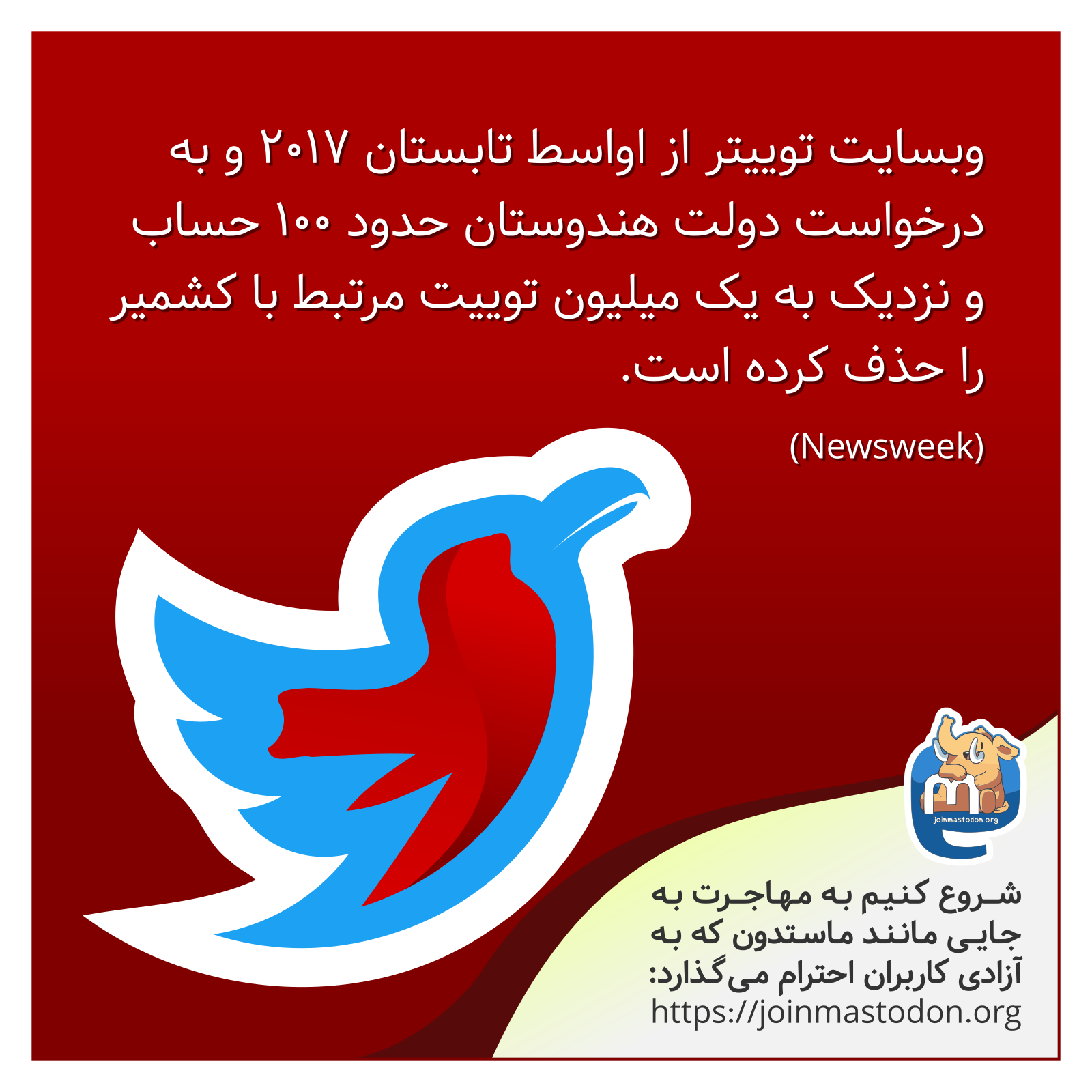 به دنبال حذف شدن نزدیک به یک میلیون توییت مرتبط با #کشمیر، توییتر متهم به سرکوب آزادی بیان و تبعیت از سانسور دولت هند شده است. در دو سال گذشته تقریبا صد حساب کاربری از دسترس خارج شده که در تعارض با هویت این شبکه در دادن فضای ابراز عقیده است.
