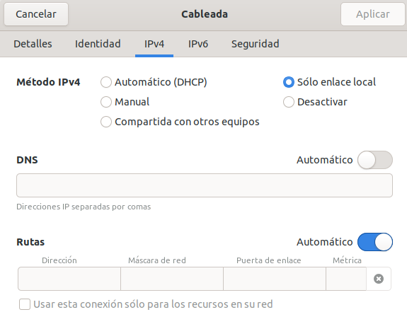 8.Selecciona la pestaña “IPv4” , y en el casillero “Método” elige “Automático (sólo direcciones)” . Y en el casillero “Servidores DNS” escribe 127.0.2.1. Dale click en el botón “Aplicar” y reinicia la red escribiendo el siguiente comando en la terminal