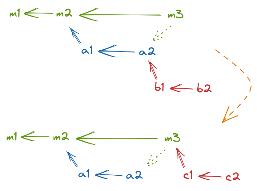 If we try to rebase, something strange happens. The history of the red branch doesn’t only include b1 and b2 but also a1 and a2. Why so? Simply because b1 is based on a2, which is based on a1. Because of the nature of squash merge, we don’t have a1 and a2 on m3. We only have their changes but not any reference to those commits. So there are possibilities of conflict between a1 and a2 changes and the changes in m3 (if there are more commits, reverting each other in the blue branch).