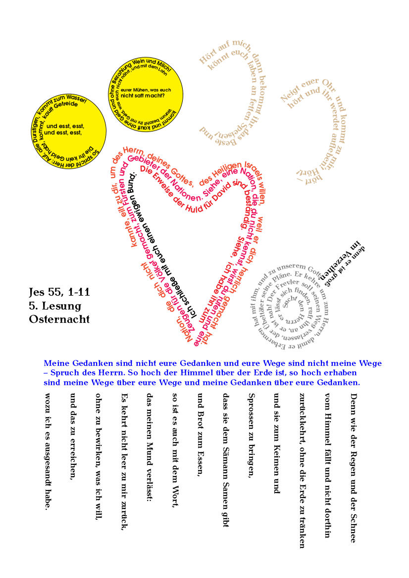 Gib mir Liebe ins Herz - dieses Lied begleitet uns schon seit dem Palmsonntag. Und heute Abend möchten uns alte Texte aus der Bibel, dem Wort Gottes, erschließen, wie dieser Wunsch mehr in Erfüllung gehen kann. Ich möchte mich heute an der Lesung aus dem Buch Jesaja orientieren. Diesen Text habe ich etwas gestaltet. Sie können ihn im Aushang anschauen, oder auch auf einem meiner Blogs im Internet. Gottes Wort kehrt nicht leer zu IHM zurück, es bewirkt was ER will - so haben wir in dieser Lesung gehört. Der Prophet Jesaja weiß auch, dass menschliche Denkmuster nicht alles erfassen können. Der Sieg des Lebens über den Tod - den wir heute feiern, wenn wir Jesu Auferstehung vergegenwärtigen ist ein gutes Beispiel für solche Gedanken, die sich uns Menschen nicht direkt erschließen. Österlich zu denken unterscheidet daher Glaubende von anderen Menschen. Die Gewissheit, dass Jesus lebt, erschließt andere Quellen der Liebe, erschließt andere Verhaltensweisen. Wer diesen lebendigen Herrn mit seinem Lebensprogramm Jesus, der Name bedeutet ,,Gott rettet’’, sucht, wird merken, ER lässt sich finden. Mir ist in den letzten Jahren dafür die Erfahrung der Emmausjünger ans Herz gewachsen. Miteinander sind sie auf dem Weg, suchen, hören auf das Wort der Schrift, und erleben, wie eine neue Sicht sich auftut, sie in diesen Glauben an Jesu Auferstehung hineinfinden. Festgefahren wie diese können wir uns oft wahrnehmen - das Suchen mündet oft in eine persönliche Offenheit für den Bund, den Gott mit uns geschlossen hat in Jesus Christus. Wir können erkennen, wie im Danken, Teilen und Segnen Liebe in unser Herz strömt. Wie wir so zu IHM kommen, hörend und auch erfahren können, wie ER in unser Herz kommen kann - das ist ja das Wesen der Tauferneuerung, die wir gleich miteinander vollziehen. Denn das Taufversprechen meint ja, Jesu Beispiel soll unser Leben leiten, wir verbinden uns mit IHM, dem Lebendigen und vertrauen ihm das eigene Leben an.